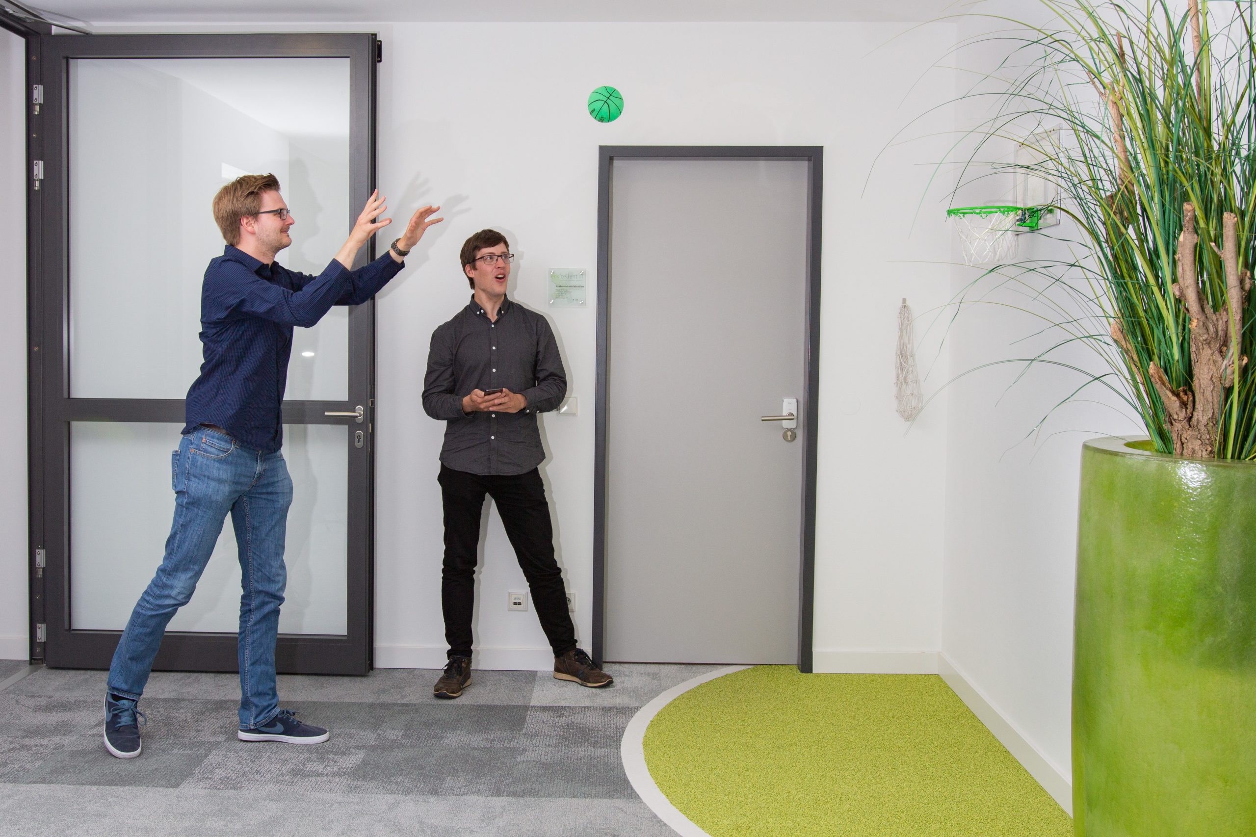 Über ein spezielles Teppichkonzept landet man früher oder später immer bei einer Station, – und so ein kleiner Basketballkorb, eine kurze Flur-Sprintstrecke, eine Golf-Ecke oder Gymnastikbälle lassen einen doch gleich aufgelockert und beschwingter an die nächste kniffelige Aufgabe oder ins nächste Team-Meeting gehen.